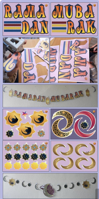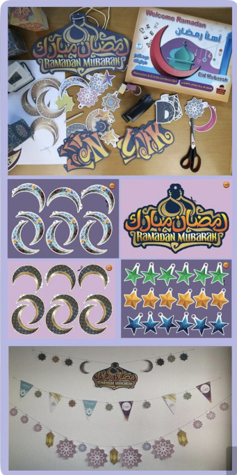 تحتوي هذه المجموعة على عدد كبير من العناصر الرائعة لشهر رمضان والعيدين. وهي مصنعة من أفضل أنواع الورق المقوى السميك ومطبوعة بألوان زاهية