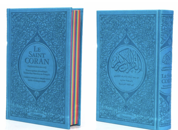- Le Saint Coran Rainbow (Arc-en-ciel) – Transcription (phonétique) en caractères latins et Traduction des sens en français – Edition de lux (Couverture Cuir bleu)
