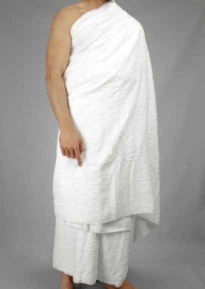 • Les hommes doivent porter un habit composé de deux pièces d’étoffe blanche, non cousues, dans lesquelles les pèlerins s’enroulent, en prenant soin de libérer l’épaule droite. De plus, leur tête et leur visage ne doivent pas être recouverts.