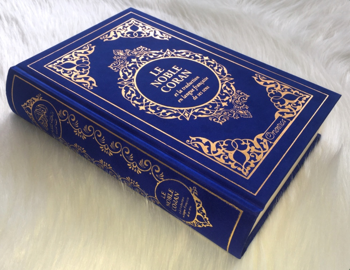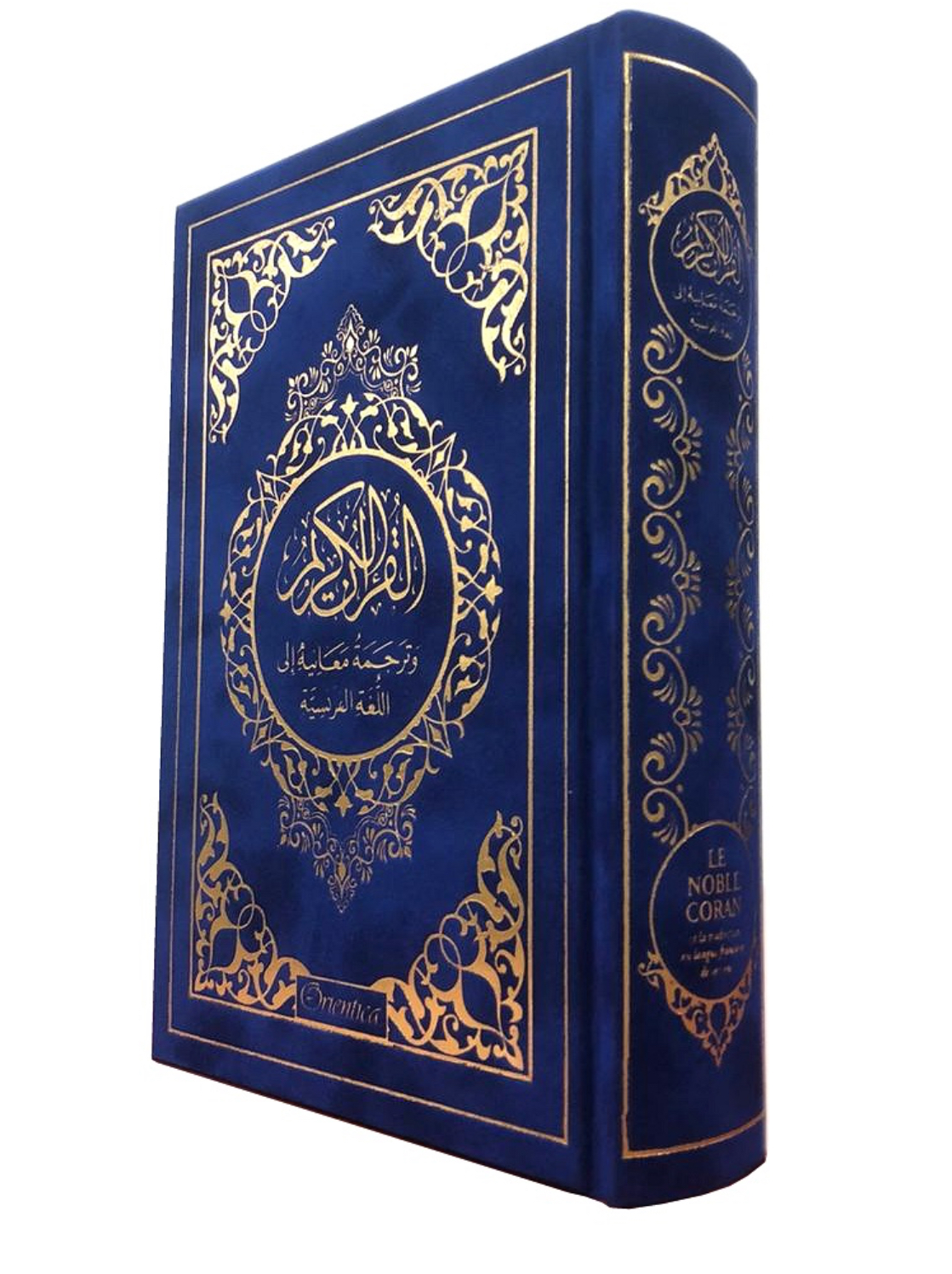 Le Noble Coran et la traduction en langue française de ses sens (bilingue français/arabe) – Edition de luxe couverture cartonnée en daim couleur Bleu dorée