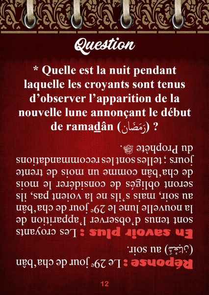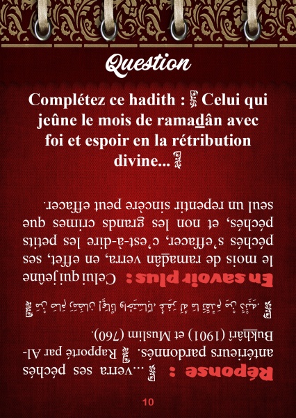 Sources des informations du jeu : Les informations contenues dans ce jeu sont tirées principalement du Coran et de la Sunna. La section « En savoir plus » offre des détails supplémentaires et des preuves issues des sources les plus authentiques. Nous avons notamment utilisé le livre «Le jeûne du Ramadan» des éditions Al-Haramayn, qui compile divers travaux de savants renommés comme Cheikh ‘Abdul-‘Azîz Ibn Bâz, Al-Albânî, Al-‘Uthaymîn et ‘Abdur-Razzâq Ibn Badr.
