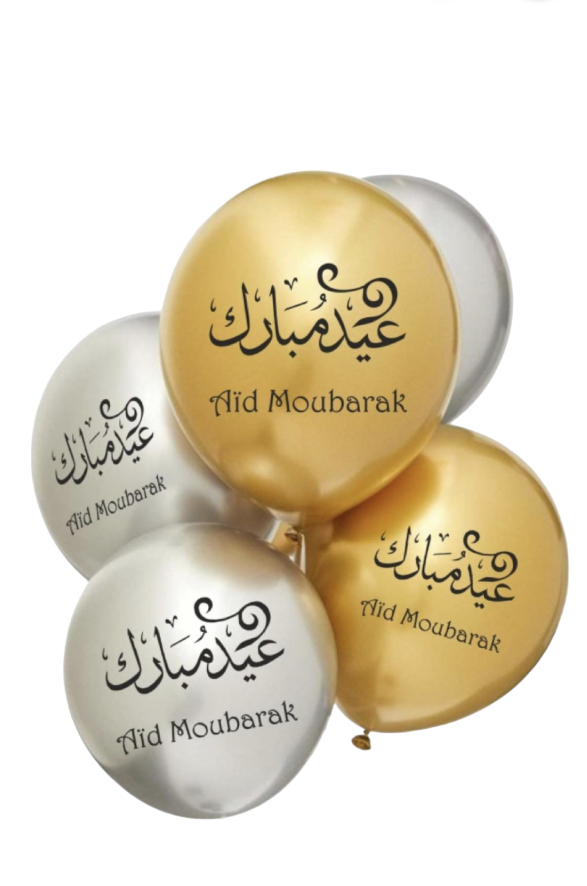 Sachet de 10 ballons Aïd Moubarak (écrit en français et arabe des deux côtés). Au total 5 ballons argentés et 5 dorés.