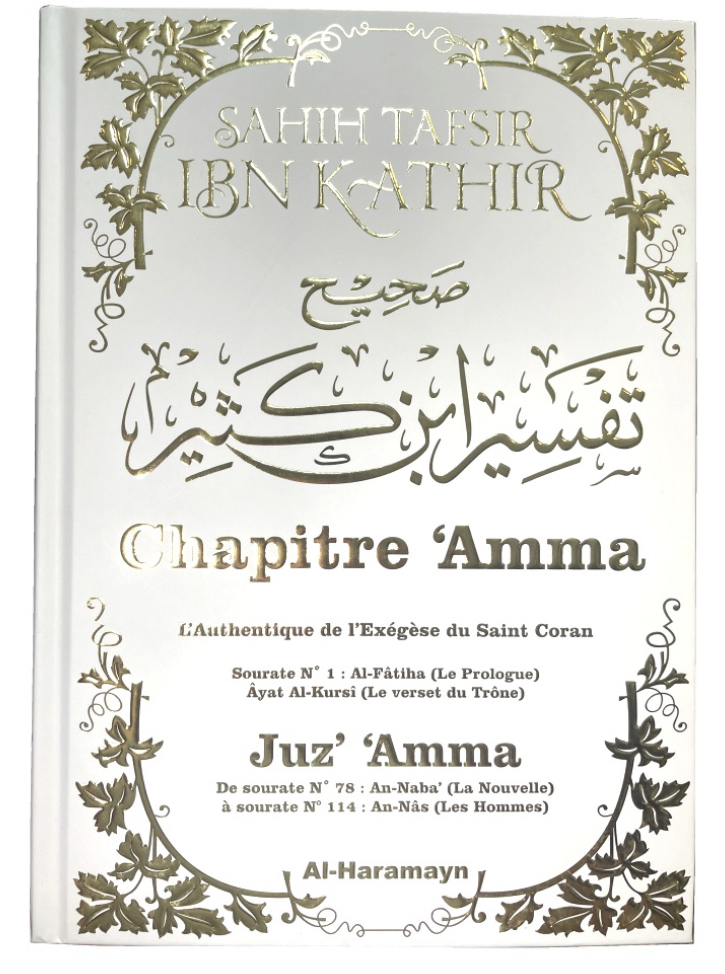 Ce livre contient Sahîh Tafsîr Ibn Kathîr (صَحِيحُ تَفْسِيرِ ابْنِ كَثِير) – L’authentique de l’Exégèse de l’imam Ibn Kathîr pour Sourate N˚ 1 : Al-Fâtiha (Le Prologue) – Âyat Al-Kursî (Le verset du Trône) et le Chapitre Amma (Juz’ ‘Amma جزء عم) : De sourate N˚ 78 : An-Naba’ (La Nouvelle) à sourate N° 114 : An-Nâs (Les Hommes).
